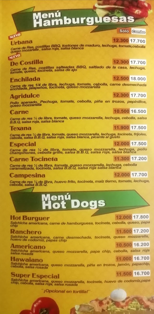 Carne de res 1/4 de libra,carne desmechada, tocineta,picante, jalapeños,lechuga,cebolla,tomate,queso,salsa de ajo